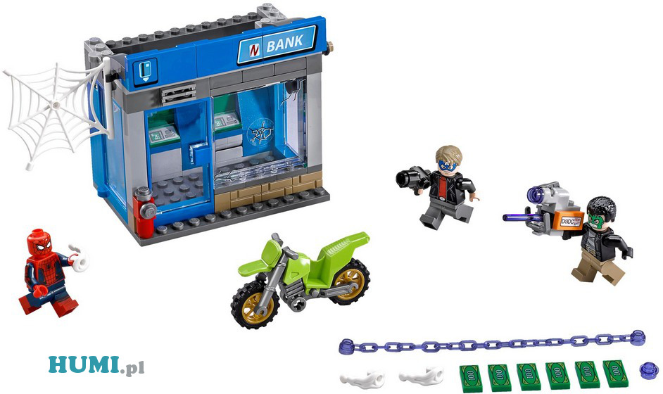 Bandyci rabują bank — pędź na pomoc ze Spider-Manem! Nie daj się nabrać na ich maski Hulka i Kapitana Ameryki. To nie są superbohaterowie! Próbują ukraść bankomat za pomocą hybrydowego Pogromcy bankomatów strzelającego klockami i pistoletu z hybrydowym łańcuchem. Wdrap się na budynek i ostrzelaj ich z broni energetycznej Spider-Mana. A potem złap ich, zanim zdążą uciec na motocyklu z ukradzionymi pieniędzmi!