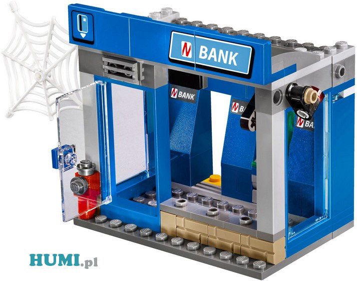 • Bank można otworzyć, by łatwiej dostać się do środka. Budynek ma otwierane drzwi frontowe, okno z funkcją wybuchania, dwa bankomaty — jeden wyjmowalny i drugi z funkcją wybuchania i rozrzucania 6 banknotów LEGO® — a także ściany, po których Spider-Man może się wspinać, pajęczynę i hydrant na zewnątrz.