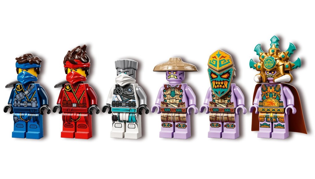 W komplecie 6 minifigurek z serialu telewizyjnego NINJAGO®: wyspiarski Jay, wyspiarski Zane i wyspiarski Kai, którzy stają do walki z wodzem Mammatusem, strażnikiem grzmotu i strażnikiem gromu. Wszystkie minifigurki wyposażone są w imponującą broń.